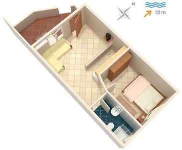 Apartman 5 je manji apartman, (2+1),nalazi se na prvom katu kuće, smješten je boÄno, sa terase se pruža pogled na more, sastoji se od manje spavaće sobe (braÄni krevet), kupaonice (tuš kabina), kuhinja kompletno opremljena (mikrovalna pećnica, kuhalo za vodu) , dnevni boravak sa jednim ležajem koji se može raširiti. Ovaj apartman idealan je za 2 osobe do max 3 osobe.